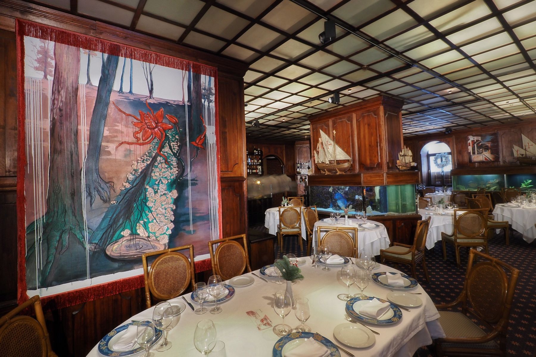 При подготовке подобных проектов гастрономическое пространство преобразовывают в выставочное (вспомним лондонский HIX). Но интерьеры «Сирены» настолько самодостаточны, что в них едва ли найдется что поменять. Здесь все подчинено морской теме: аквариумы под ногами и по периметру, модели фрегатов и галеонов, напоминающий рыболовную сеть потолок. Завладеть вниманием посетителя в таких условиях — непростая задача и, может быть даже бессмысленная, если не попробовать соединить мифологию заведения с творчеством художников.