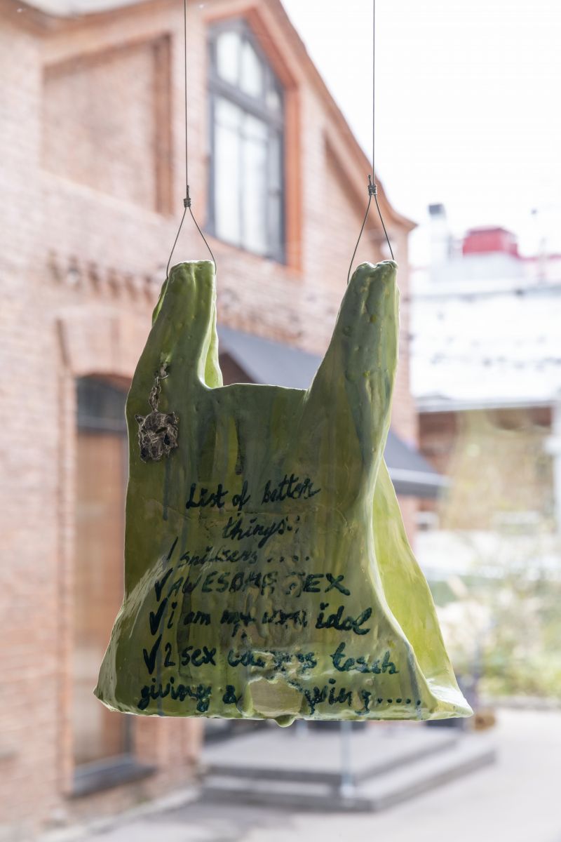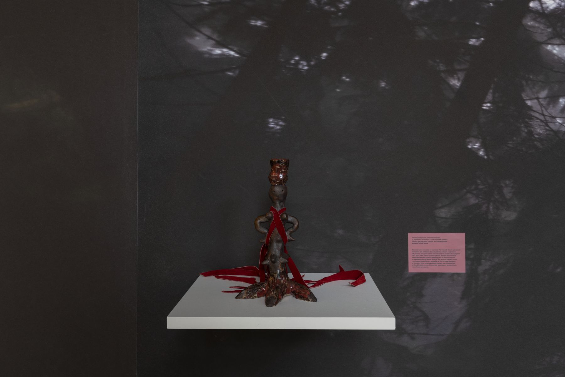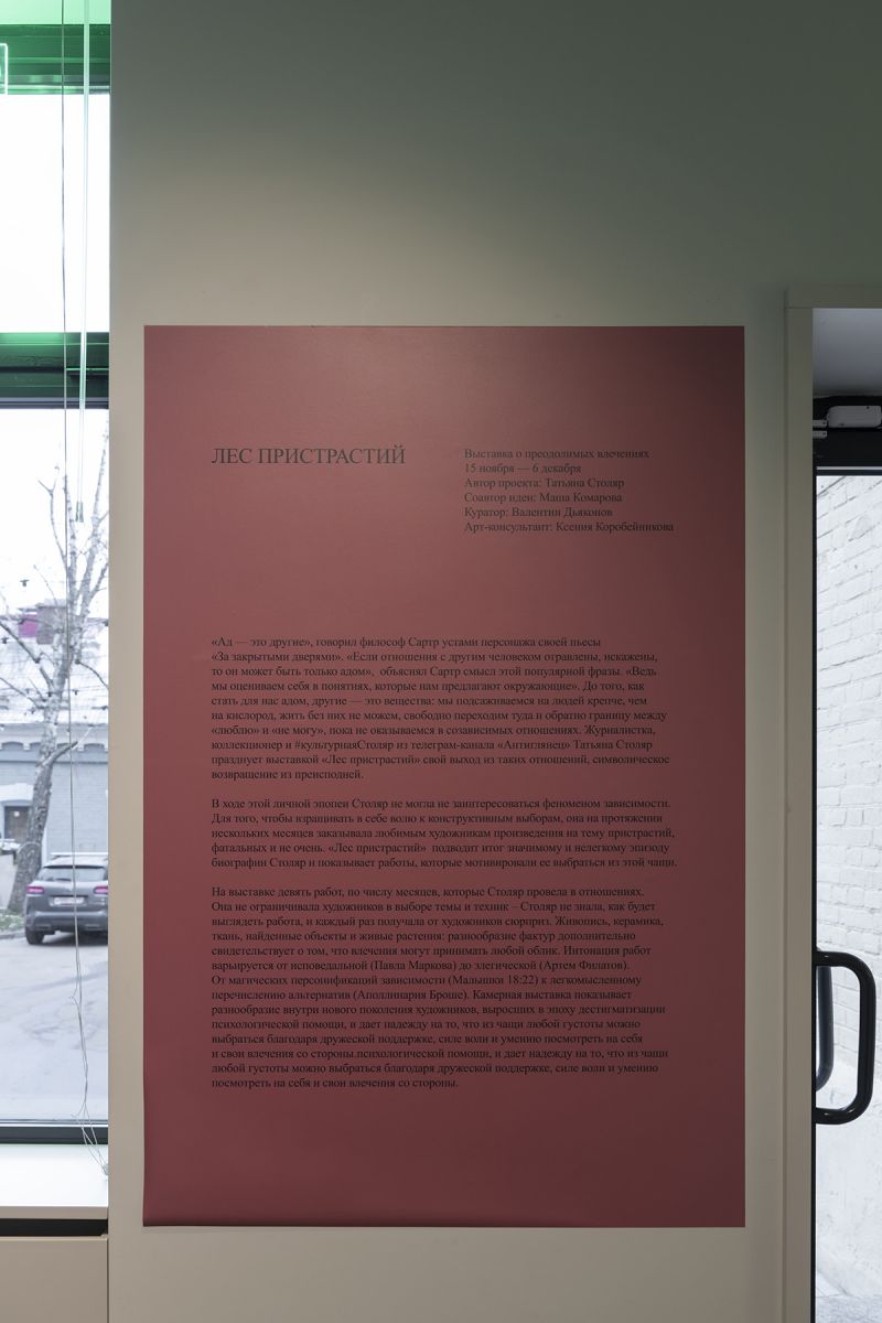 На выставке девять работ, по числу месяцев, которые Столяр провела в отношениях. Она никак не ограничивала художников в выборе темы и техник – Столяр не знала, как будет выглядеть работа, и каждый раз получала от художников сюрприз. Живопись, керамика, ткань, найденные объекты и живые растения: разнообразие фактур дополнительно свидетельствует о том, что влечения могут принимать любой облик. Интонация работ варьируется от исповедальной (Павла Маркова) до элегической (Артем Филатов). От магических персонификаций зависимости (Малышки 18:22) к легкомысленному перечислению альтернатив (Аполлинария Броше). Камерная выставка показывает разнообразие внутри нового поколения художников, выросших в эпоху дестигматизации психологической помощи, и дает надежду на то, что из чащи любой густоты можно выбраться благодаря дружеской поддержке, силе воли и умению посмотреть на себя и свои влечения со стороны.