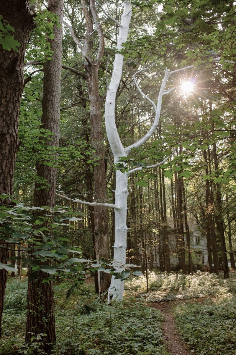 Природные интеграции в парке Дома творчества созданы под руководством кураторов Кати Крыловой и Насти Григорян. Они характеризуют выставку «Направо — белый лес» как, прежде всего, мемориальное событие — и событие странного формата: «Подобно экологичному погребению — в обход металлических оград и тряпочных цветов — выставка природных интеграций как способ памятования превратила поэтическое тело Александра Еременко в питательную среду для нового искусства. Предложив художникам создать объекты, вдохновленные стихотворением «Переделкино», мы получили визуально деликатные отклики на скрытые в нем смыслы. Эти работы похожи на ироничные строки поэта: воспринимая их вне контекста места и его истории, мы рискуем обмануться их простотой. Развиваясь в русле вольного творчества — неподконтрольного владельцу тела, не призванного говорить о покойном только хорошее — эта выставка превратилась в неформальный мемориальный эксперимент, который подверг переделке все компоненты стандартных памятных событий».